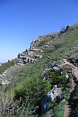 На прилегающей краевой стене видны выходы песчаника. Здесь и там тропа огибает большие обвалы.