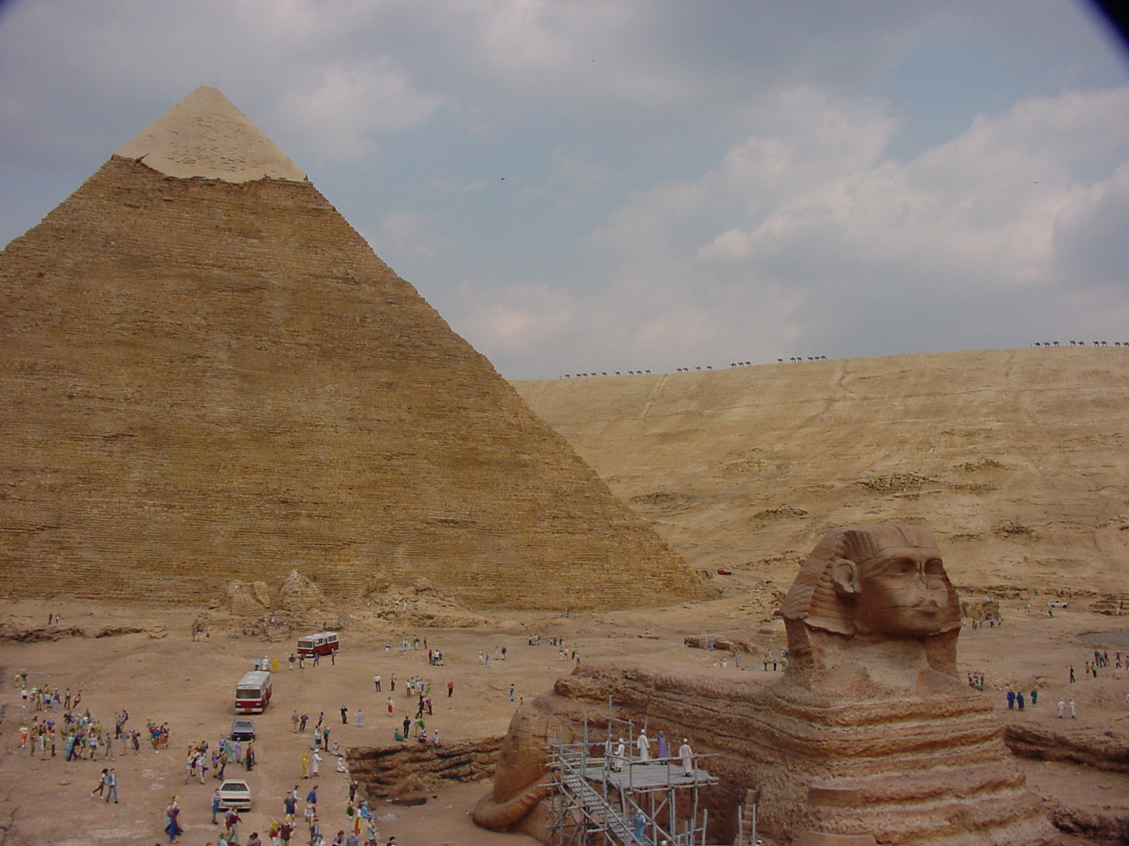 Песчаное плато Гизы является одним из самых популярных мест в Египте. Здесь находятся знаменитые пирамиды, которых в целом начисляется больше тысячи, а самые большие из них — пирамиды Хеопса, Хефрена и Микерина. Кроме того, нельзя не заметить стражника некрополя — Большого Сфинкса. Именно Сфинкс до сих пор несет за собой темные загадки прошлого. Как известно, Большой Сфинкс представляет собой огромную статую, длина которой составляет целых 72 метра, а её высота достигает 20 метров. Сама статуя, выглядит как существо с головой человека (предположительно это было лицо фараона Хефрена) и телом льва. Статуя значительно изменилась под воздействием времени, помимо огромных искажений в чертах лица, исчез гипс, который покрывал облицовку Сфинкса и был ярко разукрашен в синий, красный и желтый цвета. Ученые установили, что изначально Большой Сфинкс был окрашен вообще в фиолетовый (синий) цвет полностью, а также нес на себе службу места для казни и повешения.
