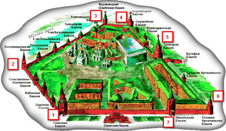 Кроме указанных выше в Кремле есть и другие башни. Их названия и расположение смотрите на карте Московского Кремля.