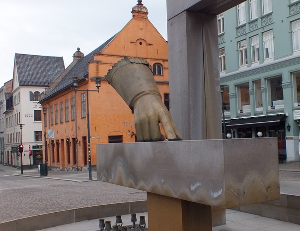В квартале Квадратурен находится одна из достопримечательностей Осло — площадь Christiania Torv, окруженная старейшими дома в Осло. Здания относятся к первой половиной XVII века, в одном из них была первая в истории Осло Ратуша. А сейчас там находится ресторан, тоже с норвежской кухней. На этой же площади стоят скульптура в виде огромной перчатки Кристиана, показывающей, где строить новый город. И домик палача тут же. Удобно 🙂