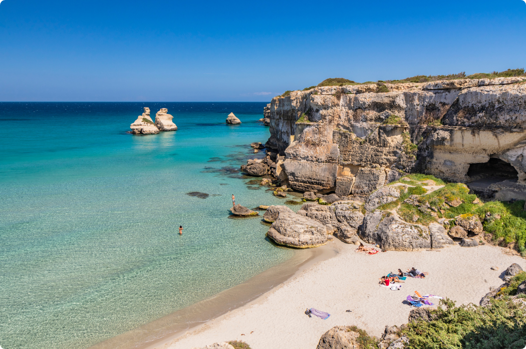 Доступ к морю осуществляется с крошечного, но прекрасно сформированного пляжа Торре-Сант-Андреа , но местные жители предпочитают нырять со скал, чтобы исследовать морские пещеры и острова внизу.