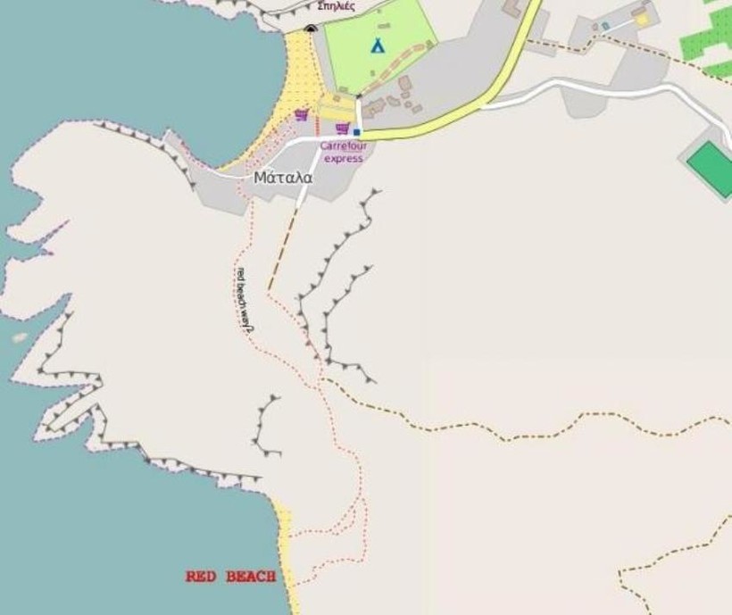 Красный пляж застелен ярко-оранжевым, коричневым и чёрным гравием. По его краям лежат огромного размера валуны. Вход в море достаточно неудобный для детей из-за каменистого дна. Узкая полоса побережья с точки зрения инфраструктуры весьма бедна. Здесь туристы не найдут магазинов, баров, раздевалок, теневых навесов и туалетов, а также водных развлечений.
