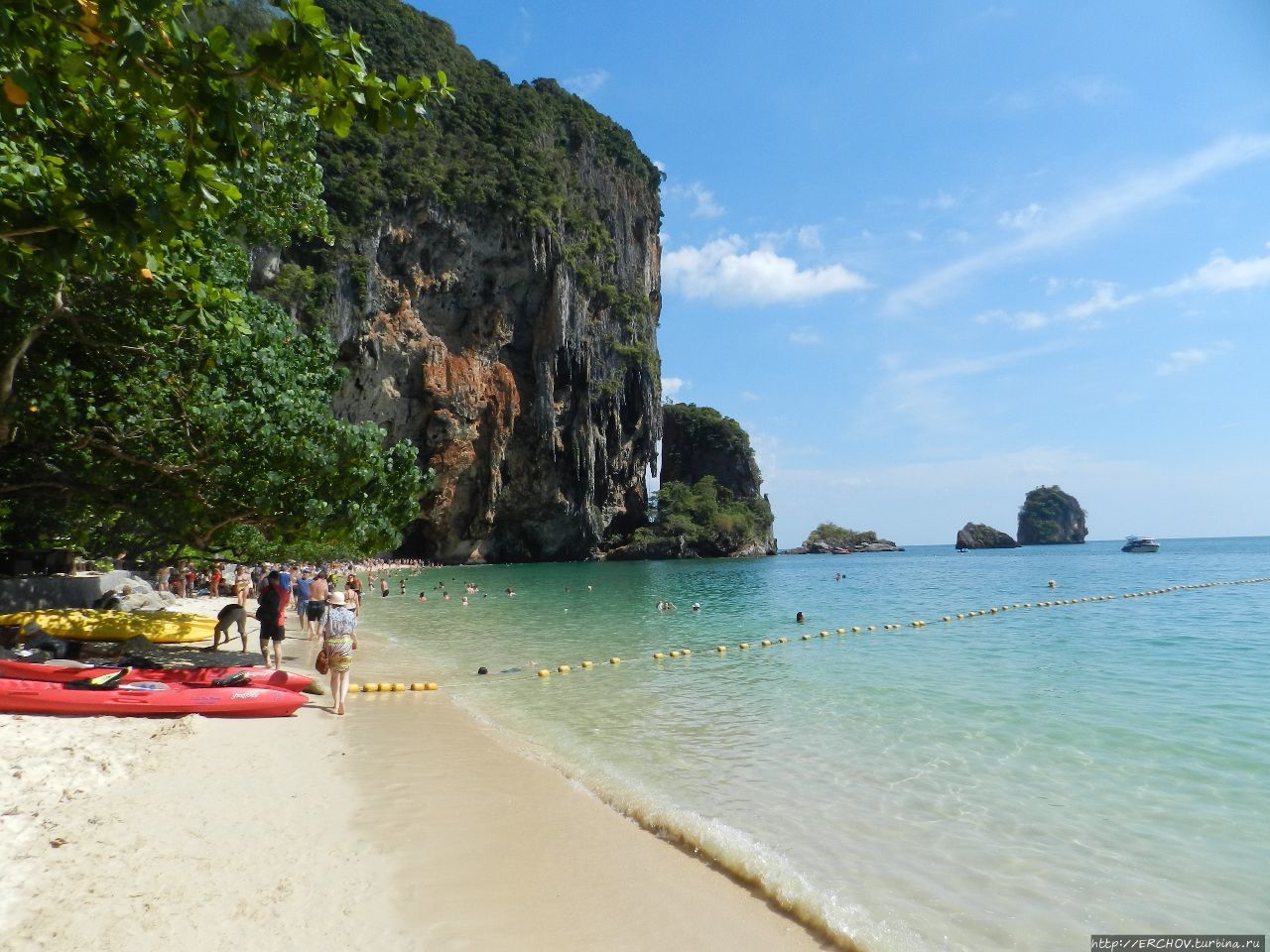 Вот тут уже поприятнее будет. Очень неплохой пляж с широкой береговой линией и прозрачным морем. Здесь много гостиниц, кафе, ресторанов разной ценовой категории, морепродукты, сувенирные лавки, макашницы с недорогой местной едой, фруктовыми шейками и холодным кофе. Сюда причаливают лодки из Ао Нанга. В общем, не самый лучший, но вполне достойный пляж. Мы обычно проходим мимо. Минусы? В отлив вода сильно уходит, и купаться можно только на пляже Пра Нанг. Зато народ равномерно рассредотачивается и нет ощущения многолюдности.