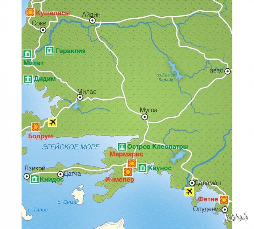 Эгейское море омывает берега Турции на западе и юго-западе. Климат здесь очень приятный – субтропический и при этом без удушающей жары. Происходит это, благодаря постоянным бризам, дующим со стороны моря. Длительный пляжный сезон – с июня по октябрь, развитая инфраструктура, обилие достопримечательностей, отели разного уровня – всё это делает курорты Турции на Эгейском море очень привлекательными для туристов.