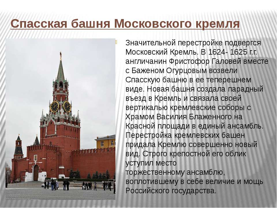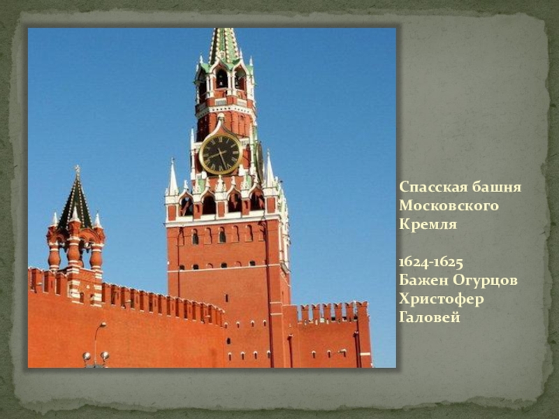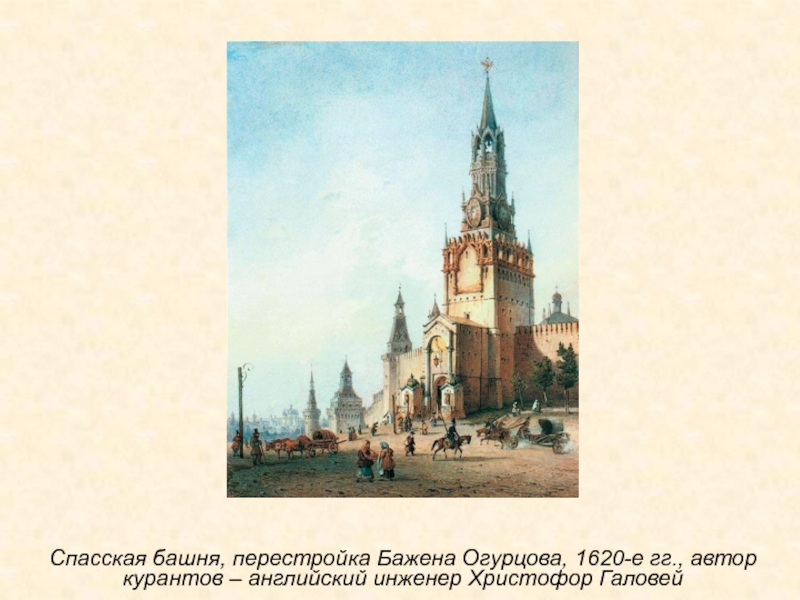 В начале XVII столетия прибывший из Англии архитектор Христофор Галовей и отечественный зодчий Бажен Огурцов перестроили башню, дополнив её каменным шатром, где поместили большие часы. Через несколько лет по приказу самодержца всея Руси Алексея Михайловича отстроенная и расширенная башня стала называться Спасской.