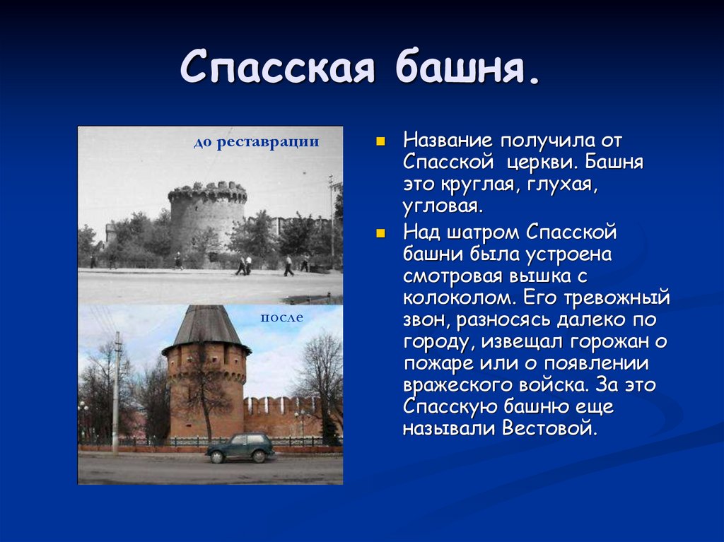 Название Спасской башне дали по надвратной иконе Спаса Смоленского.