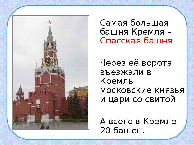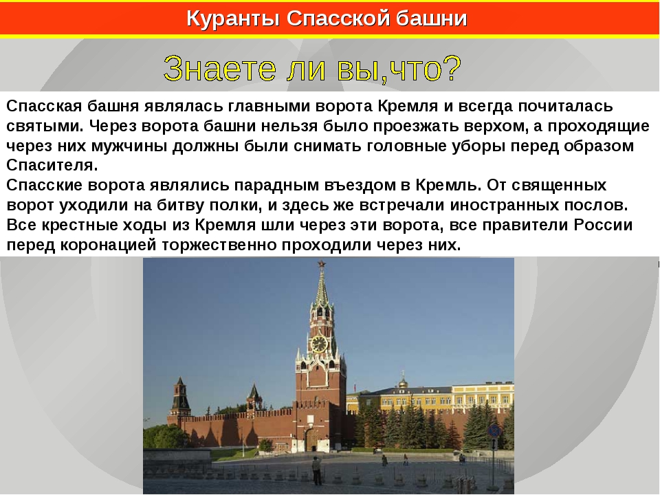 Спасская (Спасская) башня (Фроловская) хорошо известна во всем мире. Его ворота, выходящие на Красную площадь, всегда были главным входом в Кремль. Святые врата всегда вызывали восхищение у россиян. Спасские ворота использовались для королевских и патриархальных торжественных шествий, а также для приема иностранных послов.