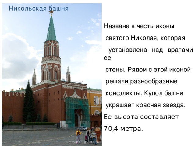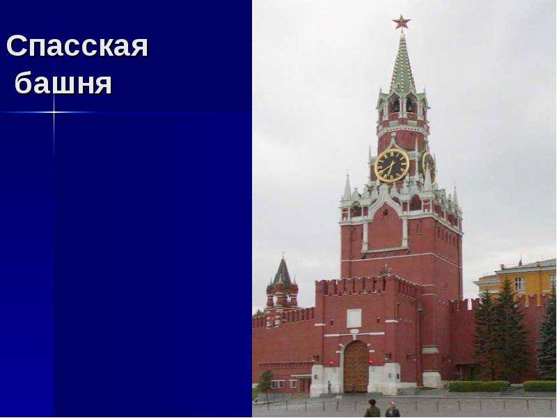 Высота Спасская башня 70 м (230 футов) — самая величественная из башен Кремля , сам символ и герб Москвы. Испокон веков это был главный вход в Кремль . Башня, как и два ее северных соседа, была построена в 1491 году итальянским архитектором Пьетро Антонио Солари.