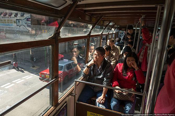 На трамвае: В городе есть историческая трамвайная система на борту двухэтажных трамваев, которые были созданы в 1904 году и курсируют вдоль северного побережья острова. Доступный, живописный способ увидеть части города с одними из лучших видов и отличными ценами. Фиксированный тариф в размере 2,30 гонконгских долларов оплачивается при выходе из трамвая, стойка для пассажиров сзади, а трамваи ходят с 6:00 до полуночи.