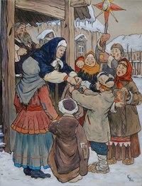 Сочельник был последним днем Рождественского поста и считался особенно строгим: нельзя было есть «до первой звезды». Семья весь день готовилась к празднику в трудах и молитвах и лишь в сумерках усаживалась за постную трапезу.