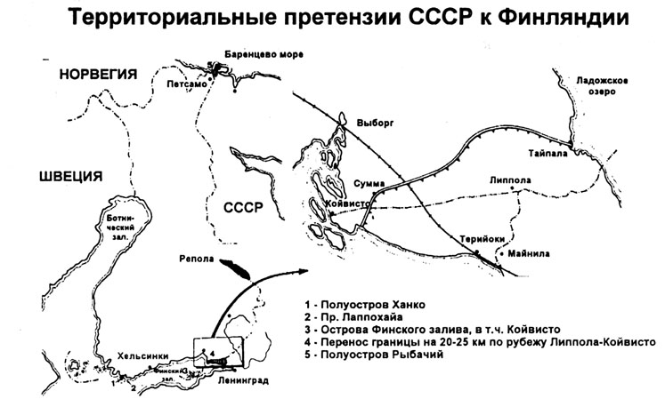 Опасаясь удара немцев с их стороны, советское правительство выступило с предложением по размещению на одном из финских островов военной базы. В случае нападения Гитлера СССР обещал свою военную помощь. Но Финляндия придерживалась нейтралитета и, боясь осуждения со стороны других стран, отказалась от заключения договора.