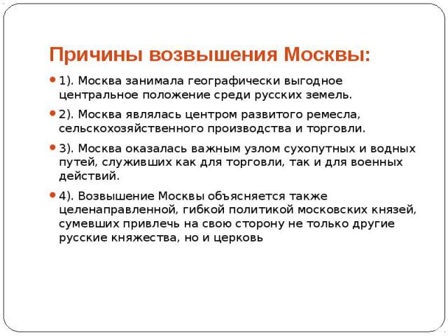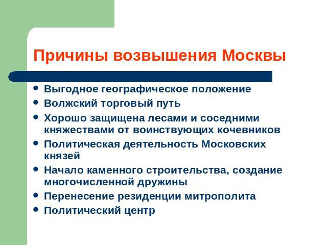 Возвышение Москвы имело несколько основных причин: