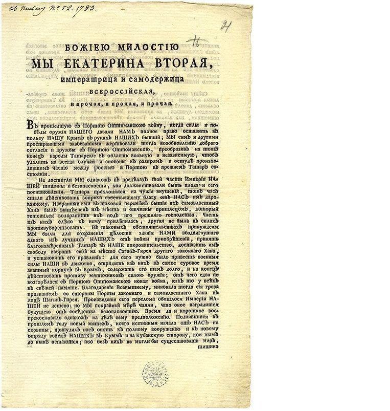 В апреле 1783-го Екатерина II подписала манифест «О принятии полуострова Крымского, острова Тамана и всей Кубанской стороны под Российскую державу». Его обнародовали спустя несколько месяцев после подписания. Из европейских государств с протестом выступила одна Франция.