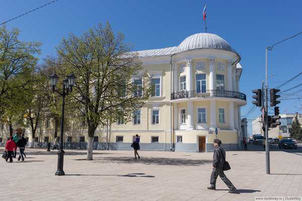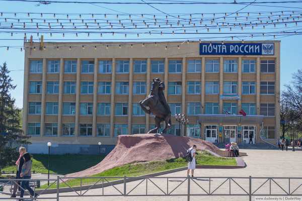 Боковой фасад здания Думы выходит на пешеходную Почтовую улицу, неподалеку памятник Евпатию Коловрату-Рязанскому богатырю