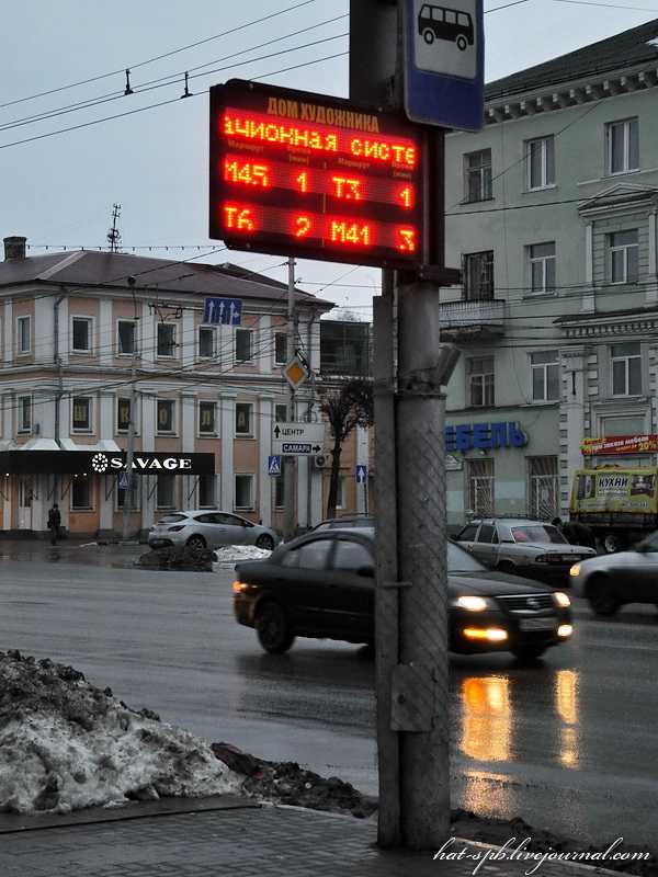 В одном из предыдущих фоторассказов посвящённых Курску, я рассказывал об установленных на центральных остановках города информационных табло со временем прихода автобусов и маршруток. Так вот в Рязани тоже такие есть, точнее подобные. Если в Курске это обычные мониторы достаточно больших размеров, с большим количеством информации (маршрутов), но с достаточно мелким шрифтом, то в Рязани табло меньшего размера, зато более яркие и с крупным шрифтом, но меньшей скоростью изменения информации. К нашему позору в Петербурге до сих пор даже на Невском проспекте не могут установить ничего подобного…