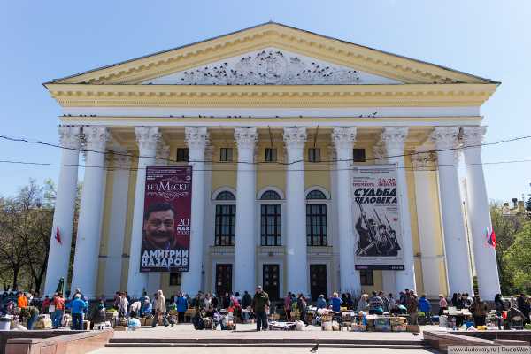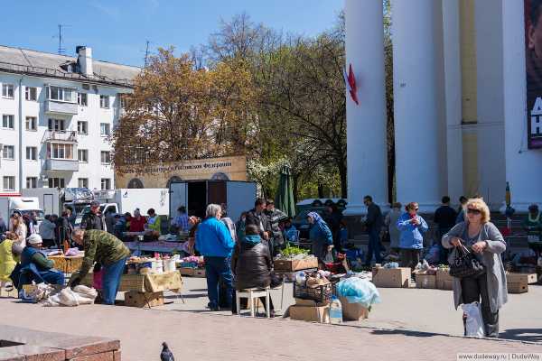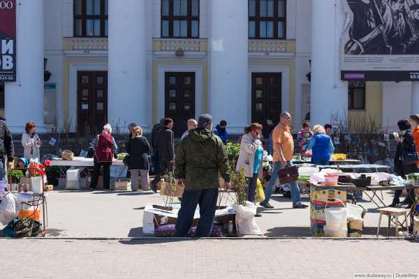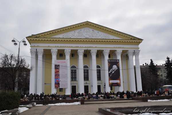 Рязанский государственный театр драмы был основан при содействии Г.Р.Державина в 1787 году под названием «Оперный дом». Современное здание театра было открыто в 1961 году. Но к сожалению театр нам запомнился с другой стороны. Вся площадь возле театра (Театральная площадь) была запружена тесной и суматошной ярмаркой-базаром. Странное, контрастное сочетание. Таких рынков с товарами народных промыслов я не видел очень давно. Тут можно было встретить даже живую рыбу! 🙂