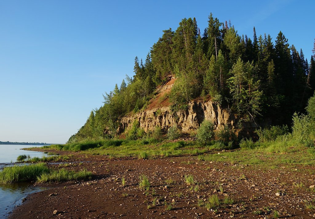 В отличие от левого, правый берег реки Камы на этом участке крут, и река прижимает к нему свое русло. Получается длинный Красноборский плес, тянущийся почти прямо километров на двадцать пять. Берег представляет край третьей террасы с выходами у самого бечевника коренных пермских пород. Высота обрыва местами доходит до 50 м. Над его желтовато- красноватым краем, выше с. Красный Бор, нависает сосновый бор, занимающий вершину берега. Из-за чистого, озонированного воздуха этот бор получил название «пьяного» — так прежде назывался и поселок. Край берега изрезан многочисленными глубокими, оврагами, густо заросшими то хвойным, то лиственным лесом. Получается картина несколько дикой, но прекрасной местности глухих лесных оврагов. У самого подножья обрыва летом располагается пристань Красный Бор.