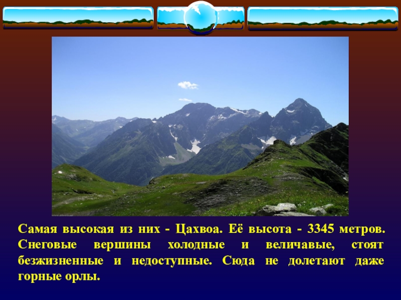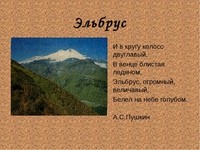 1. Кавказские горы — самые высокие горы в Европе. Наивысшая точка — гора Эльбрус (5642 метра). Есть еще 7 пятитысячников: Дыхтау — 5204 метра, Коштантау — 5152 метров, Шхара-5068 метров, Джангитау-5058 метров, Казбек-5034 метров, пик Пушкина-5033 метров и Мижирги- 5025 метров