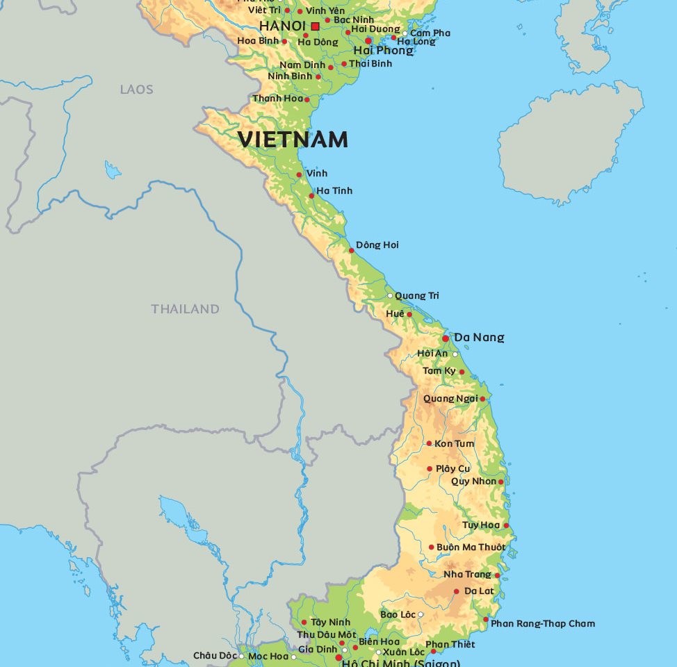 Вьетнам расположен на полуострове Индокитай, имеет протяженные границы с Лаосом, Китаем и Камбоджей. Береговая линия протяженностью более 3000 тысяч километров предоставляет прекрасные возможности для отдыха на Южно-Китайском море, именно здесь находятся лучшие пляжи Вьетнама. Подальше от побережья местность в, основном, гористая, покрыта тропическими лесами. Многочисленные реки образуют в своем нижнем течении обширные долины. Климат во Вьетнаме тропический муссонный, средняя температура вполне комфортная, от 25 до 30 градусов. Однако на севере зимой довольно прохладно, особенно в горах. Иногда здесь температура падает до нуля, если из Китая поступают холодные воздушные массы, поэтому отдыхать в северных районах лучше летом.