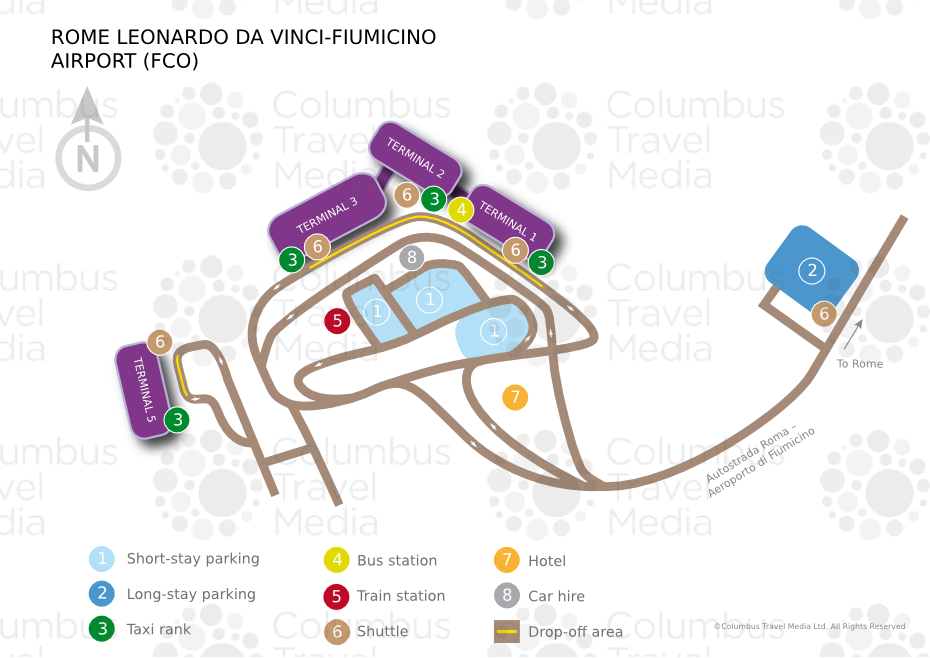 Грубо говоря, все рейсы итальянской национальной авиакомпании Alitalia используют терминал 1 как для прибытия, так и для отправления. Американские перевозчики, направляющиеся в Соединенные Штаты, и все рейсы в Израиль используют Терминал 5. См. выше важную информацию об использовании Терминала 5.