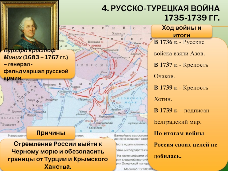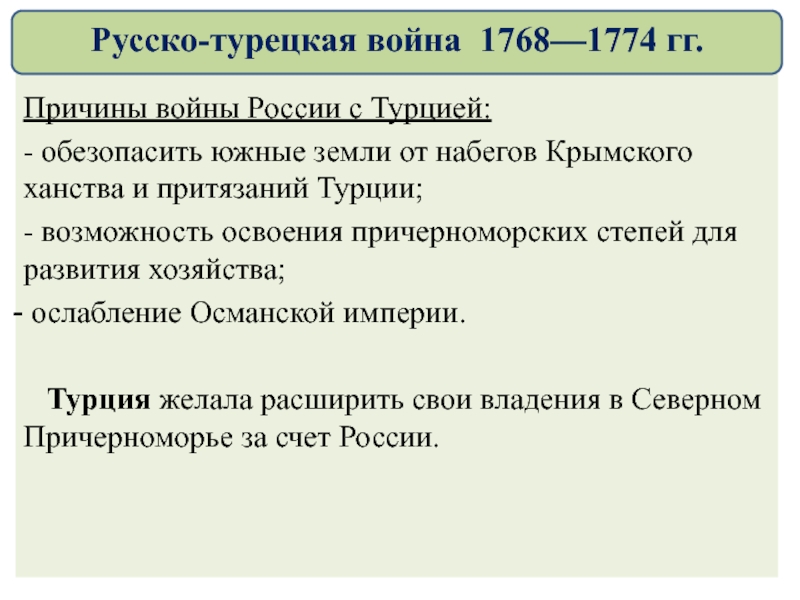 Русско-турецкая война 1768-1774 гг. была продолжением борьбы России за выход к Чёрному морю, против агрессии Османской империи, которая стремилась расширить свои владения в Причерноморье и на Кавказе и захватить Астрахань. Турция также выступала против усиления русского влияния в Польше, где в 1764 г. на престол был возведён русский ставленник Станислав Август Понятовский. Поводом к войне явилось отклонение Россией турецкого ультиматума о выводе русских войск из Польши, где они с 1768 г. вели военные действия против Барской конфедерации.