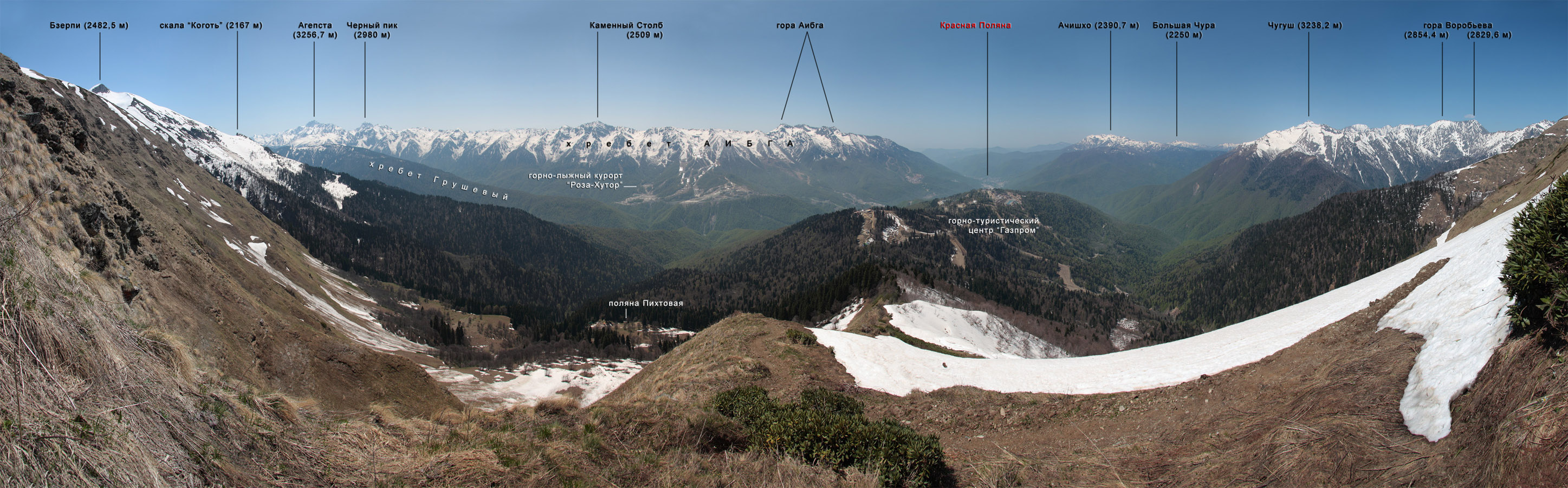 Самый первый и один из самых зрелищных гондольных подъемников «Роза Хутор» — «Олимпия» — преодолевая километровую пропасть над Сулимовским ручьем, открывает незабываемый вид на Мзымту и панораму гор Аибга и Псехако.
