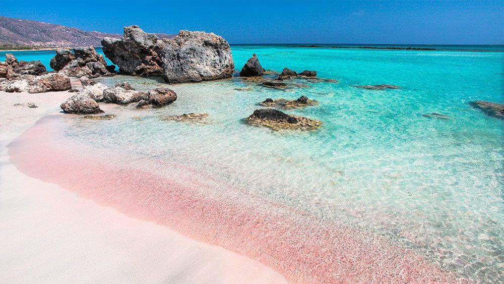 Пляж с розовым песком находится на юго-западном побережье острова Крит. Элафониси — маленький остров, который удален от Крита на 150 метров и связан с ним песчаной косой. Островок — это заповедник, на котором запрещено разбивать палатки и оставаться на ночевку. Ярко-розовый оттенок песок приобретает благодаря мелким частицам розовых кораллов и ракушек. Кристально чистая бирюзовая вода и нежно-розовый песок в сочетании дают невероятно красивый пейзаж. На острове произрастает 110 редких видов растений, а также откладывают яйца исчезающие черепахи Карета-Карета.