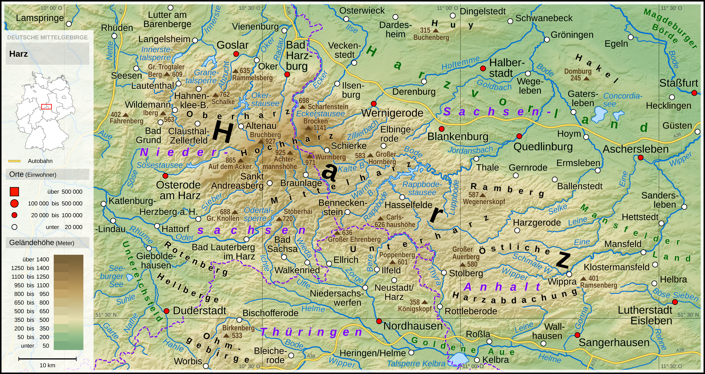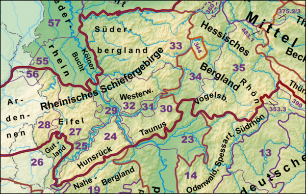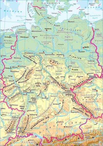К северу простираются средневысотные Рейнские Сланцевые горы, массивы Тюрингенский Лес, Гарц с легендарной горой Броккен (высота 1142 м), Тевтобургский Лес, Рудные горы. На севере расположена Северно-Германская низменность с холмами и озерами, в основном в Гольштейне, Мекленбурге. Озера имеются и в предгорьях Альп. На юге — Боденское озеро. Германия относится к бассейну Атлантического океана. Крупные реки: Рейн с притоками (Майн, Мозель), мс, зер, Эльба, Одер, Дунай. Климат Германии умеренный со среднегодовой температурой около 9° С. В северном регионе сказывается морское влияние, что и смягчает климат. В центре страны климат более континентальный: зима более холодная, а лето более теплое. Самое теплое лето — в Рейнской долине, а самые холодные зимы — в Альпах, на юге страны. Средняя температура января в Берлине от -3° С до 2° С, средняя температура июля — от 14° С до 24° С. Больше всего осадков выпадает на юге , меньше всего — на севере: до 710 мм в год. Около 30% территории Германии покрыто лесами, сосредоточенными в основном в южной части страны.
