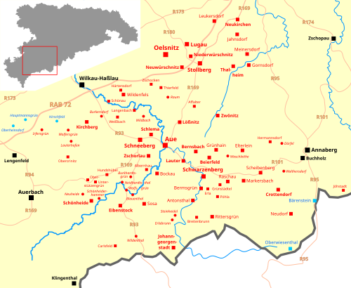 В общей сложности, в течении немногих десятилетий горные разработки привели к возникновению около 30 шахтёрских городов на саксонской и около 20 на чешский стороне Рудных гор, что сделало Рудные горы самыми густонаселёнными горами средней высоты в Европе с уникальным в мире числом шахтёрских городов. Располагая целым рядом вольностей и льгот (например, право на рынок, пивоварение, разлив алкогольных напитков, закол скота), эти новые города привлекали, наряду с шахтёрами и их семьями, ремесленников и торговцев, а также художников и ученых. Прежде всего, крупные шахтёрские города, такие как Фрайберг, Аннаберг, Мариенберг, Шнееберг или Яхимов становились, таким образом, не только экономическими, но и духовными, научными и культурными центрами, где были возведены многие великолепные религиозные и светские здания.
