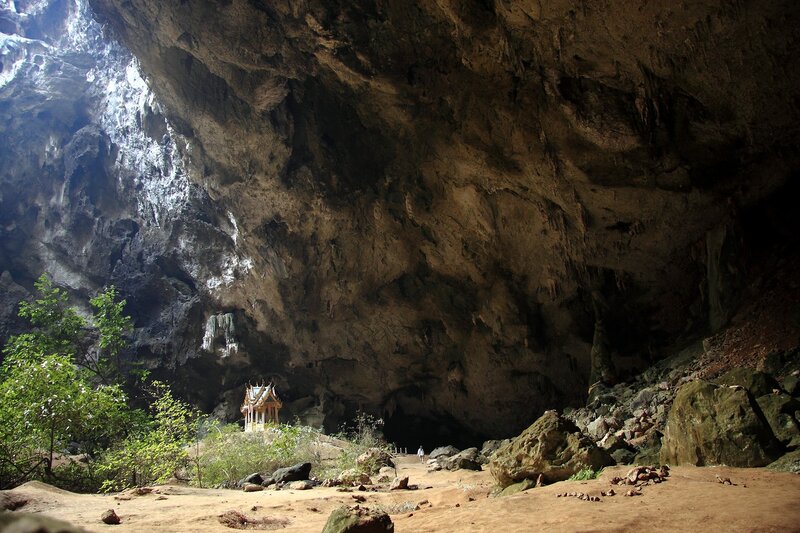 Начнем с самой первой достопримечательности пещеры Прайя Након, собственно, ради которой в этот нац парк в основном и едут. Это пещера с большой дырой вместо потолка, и внутри которой стоит небольшой храм. С утра он освещается солнцем и в этот момент там очень красиво.
