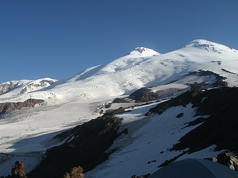 Первое зарегистрированное восхождение на гору было совершено в 1829 году Килларом Хашировым, достигшим более низкого уровня. восточная вершина. Высшая западная вершина была достигнута в 1874 году, когда гид Ахия Соттаев возглавил команду Британские и швейцарские альпинисты на вершину. В первые годы существования Советского Союза альпинизм стал популярным массовым спортом, и на горе было огромное движение. Зимой В 1936 году очень большая группа неопытных комсомольцев предприняла попытку восхождения на гору и в итоге оказалась потерпев множество смертельных исходов, когда они поскользнулись на льду и упали насмерть.Немцы коротко занял гору во время Второй мировой войны; возможно апокрифическая история рассказывает о советском пилот получил медаль за бомбардировку главной альпинистской хижины Пруит 11, когда она была занята. Позже он был номинирован на медаль за то, что не попал в хижину, а за запас топлива, оставив хижина для будущих поколений. С 1959 по 1976 год в г. сцены, которые могут принять посетителей на высоту до 3800 метров. Есть широкий выбор маршрутов в гору, но обычный маршрут без трещин продолжается. более или менее прямо вверх по склону от конца системы канатной дороги.Летом это не так. необычно для 100 человек, которые пытаются покорить вершину по этому маршруту каждый день.