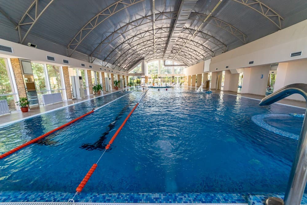 Оздоровительный комплекс санатория оборудован бассейном длиной 25х8,5 метров с каскадным душем, финскими саунами, турецкой баней, гидро- и аэромассажными установками.
