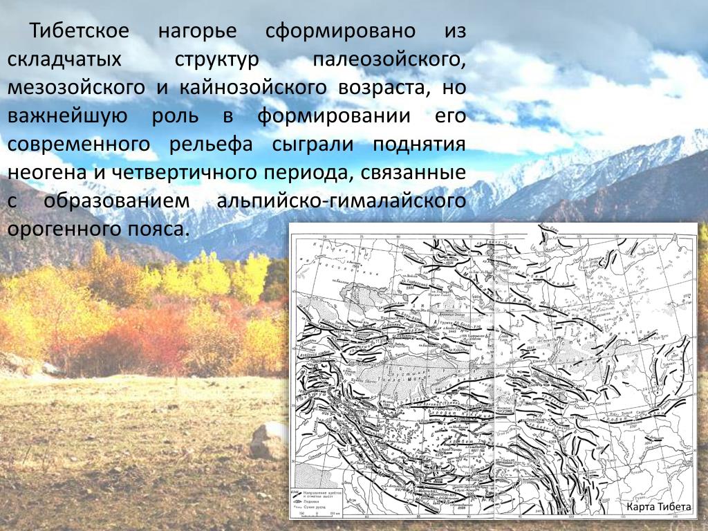 В некоторых случаях процесс складкообразования развивается более интенсивно по периферии геосинклиналей, и в результате на поперечном профиле выделяются два краевых складчатых хребта и центральная приподнятая часть гор с меньшим развитием складчатости. От краевых хребтов в сторону центрального массива простираются надвиги. Массивы более древних и более устойчивых горных пород, ограничивающие геосинклинальный прогиб, называются форландами. Такая упрощенная схема строения не всегда соответствует действительности. Например, в горном поясе, расположенном между Центральной Азией и Индостаном, представлены субширотно ориентированные горы Куньлунь у его северной границы, Гималаи – у южной, а между ними Тибетское нагорье. По отношению к этому горному поясу Таримский бассейн на севере и п-ов Индостан на юге являются форландами.