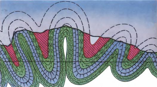 СТАДИИ ОРОГЕНЕЗА в Аппалачах: начальная – накопление осадков в вытянутом океаническом прогибе – геосинклинали (вверху). Внедрение интрузий магматических пород (в середине) приводит к поднятию первичных толщ осадочных пород и образованию гор, при этом продолжается осадконакопление. Впоследствии в поднятие вовлекаются и более молодые отложения (внизу), которые при этом испытывают складчатые и разрывные деформации. |
