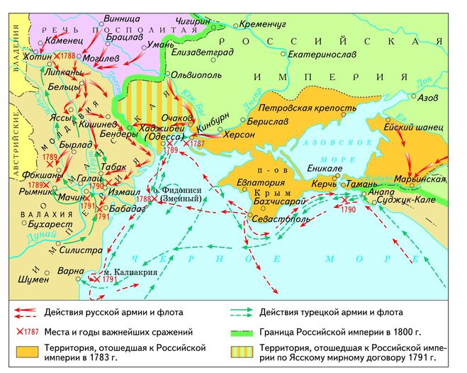 В ходе кампании 1788 г. осада и взятие крепости Хотин, осада Очакова 1788 г., в штурме которого большую роль сыграл русский флот. ВОЕННО-МОРСКОЙ. В кампанию 1789 г.Украинская армия (впоследствии объединенная Южная армия Потемкина-Таврического) развернула борьбу за Бендеры и другие крепости Бессарабии. В Фокшанском сражении 1789 г. и Рымникском сражении 1789 г. русские и австрийские войска под командованием Суворова разгромили 30-тысячный турецкий корпус Осман-паши и 100-тысячную армию великого визиря Юсуф-паши. Однако Потемкин-Таврический не пошел в наступление через Дунай и ограничился взятием крепостей Бендеры, Хаджибей (Одесса) и Аккерман. В течение 1790 кампании турки перенесли главный удар на Черноморское побережье Кавказа, направив к крепости Анапа 40-тысячный корпус баттала Хусейн-паши для наступления на Кубань и подготовки десанта в Крыму. Черноморский флот в сражении у острова Фидониси (1788 г.), Керченском сражении 1790 г. и Тендровском сражении 1790 г. нанес поражение турецкому флоту.