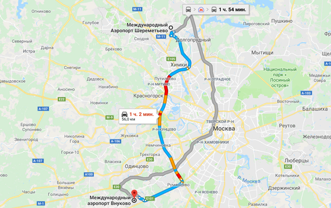 Время в пути от Москвы до аэропорта Шереметьево зависит от выбранного вами вида транспорта.