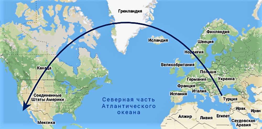 Расположение аэропортов Москвы и Нью-Йорка указано ниже. Нажмите на карту, чтобы увидеть маршрут рейса из Москвы в Нью-Йорк и направление движения.