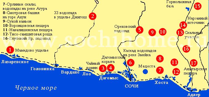По ссылке есть вся нужная информация с фотографиями и координатами. Мне больше всего нравятся природные достопримечательности: Дендропарк, Тисо-Самшитовая роща, Агурские водопады.