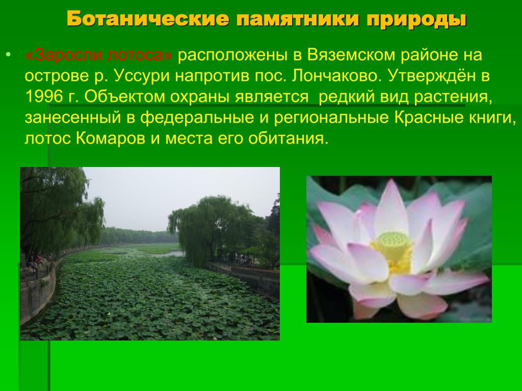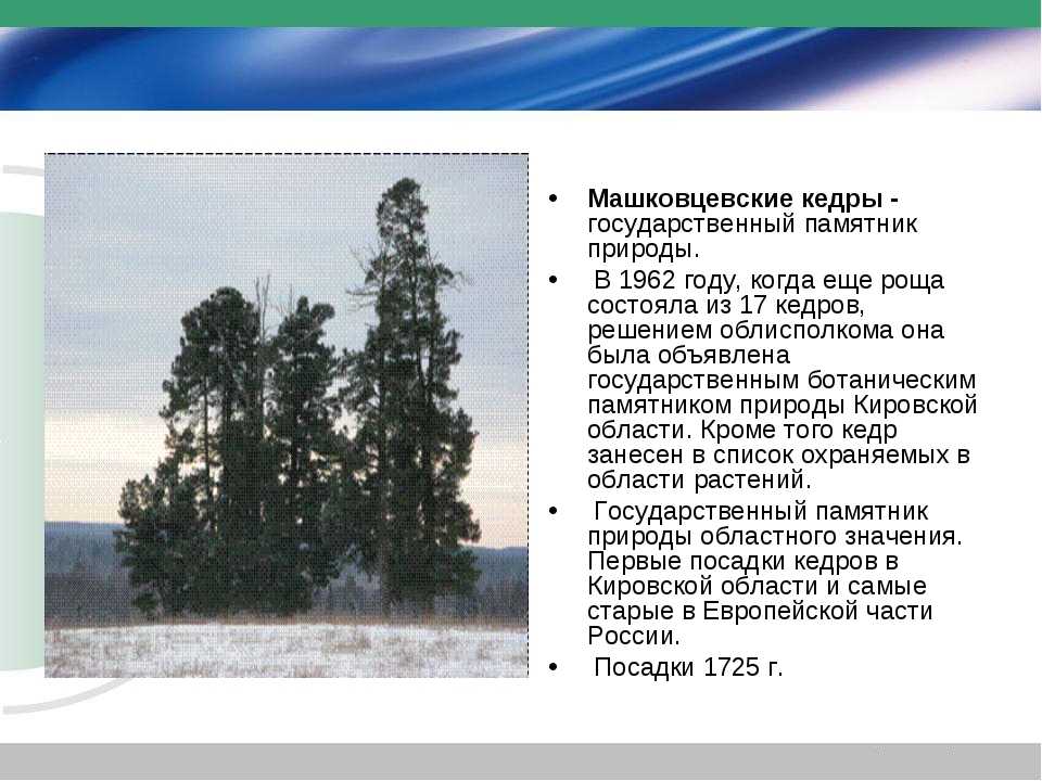 К ботаническим памятникам принадлежат различные уникальные рощи, боры, дубравы (липы Алтая, кедры и лиственницы Свердловской области), отдельные деревья, участки степи, дендропарки.