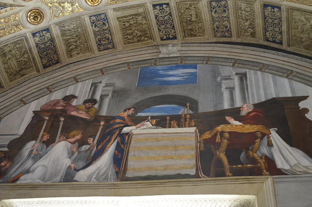 Роспись «Месса в Больсене» посвящена чуду, свершившемуся в 1263 году: хостия – лепешка, предназначенная для причастия – в руках неверующего священнослужителя вдруг начала истекать кровью.