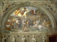Станца Константина – последнее из четырех помещений, называемых станцами Рафаэля. Роспись в нем посвящена борьбе римского императора Константина с язычниками. Сюжет начинается с фрески под названием «Видение Креста», повествующей о том, как Константин перед битвой с Максенцием у Мульвийского моста увидел сияющий крест с надписью «Сим победиши».