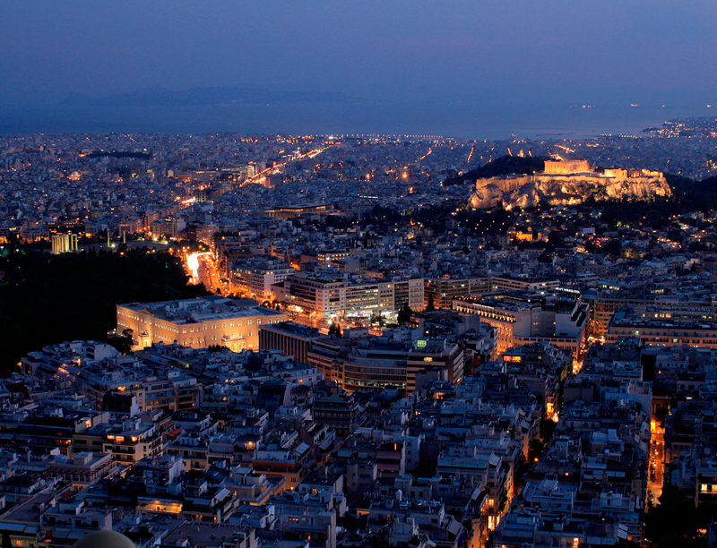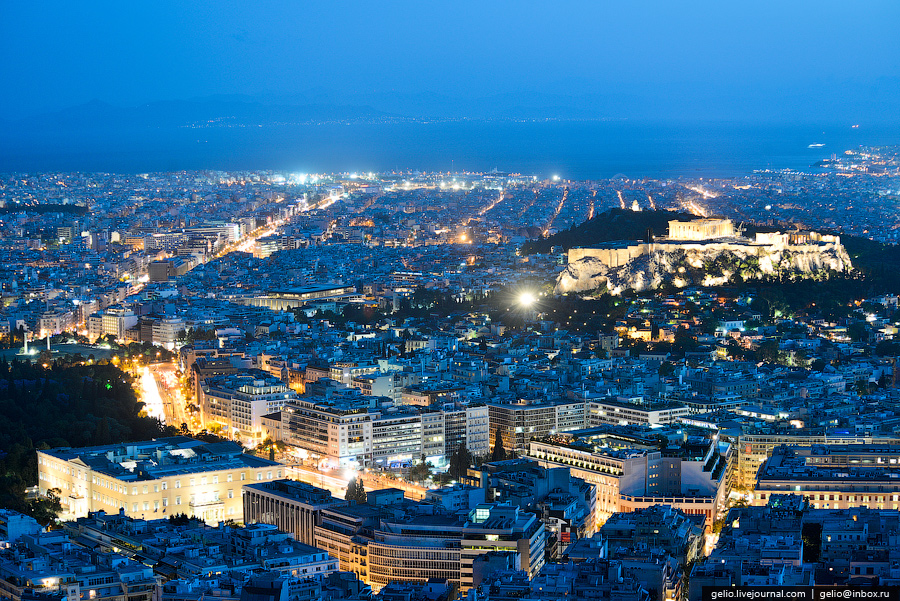 Не будет преувеличением сказать, что Афины — это город, который никогда не спит, кипит жизнью и предлагает бесчисленные варианты ночных развлечений. На самом деле, поздние ночи — это большая часть общительного, импульсивного афинского образа жизни. Прогулка по историческому центру города обязательна как для местных жителей, так и для иностранных гостей; но как приятно гулять по ночным Афинам, так же приятно любоваться ими с высоты, так как это похоже на освещенный лабиринт, в котором время от времени мерцают огни.