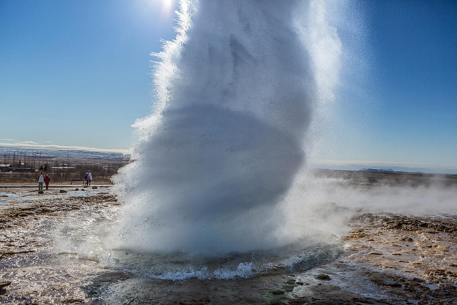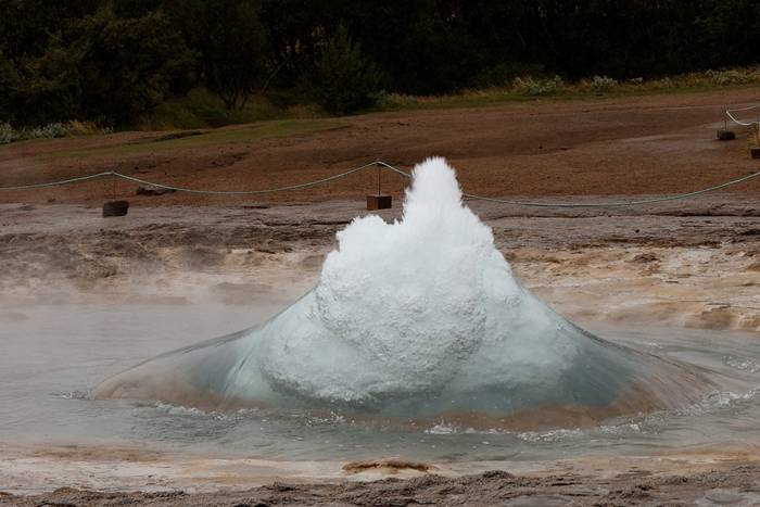 Сразу после всплеска, вода отступает в жерло гейзера, но через секунду снова выступает наружу, словно изучая реакцию туристов, что только что стали свидетелями впечатляющего шоу. Приближение очередного извержения можно предугадать. Незадолго до этого начинается заметная пульсация воды в горловине гейзера. Это происходит под воздействием пара, что скапливается в нижних слоях и устремляется к вершине. Ну а перед тем, как выбросить воду, в гейзере образуется своеобразный пузырь, который вот-вот лопнет, что заставляет даже самых смелых туристов медленно попятиться назад. Под воздействием пара пузырь разрушается и происходит извержение.