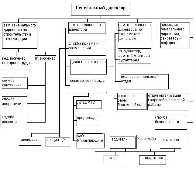 У каждого хорошего отеля своя структура, например, в одном отеле шеф-повар подчиняется менеджеру службы питания, в другом — непосредственно генеральному директору. Организационная структура дает возможность посмотреть на перспективы развития отеля, но никак не влияет на услуги отеля или стоимость работы. Структура не влияет на то, дорогой он или недорогой, скорее, наоборот — ценовая категория отеля влияет на структуру.