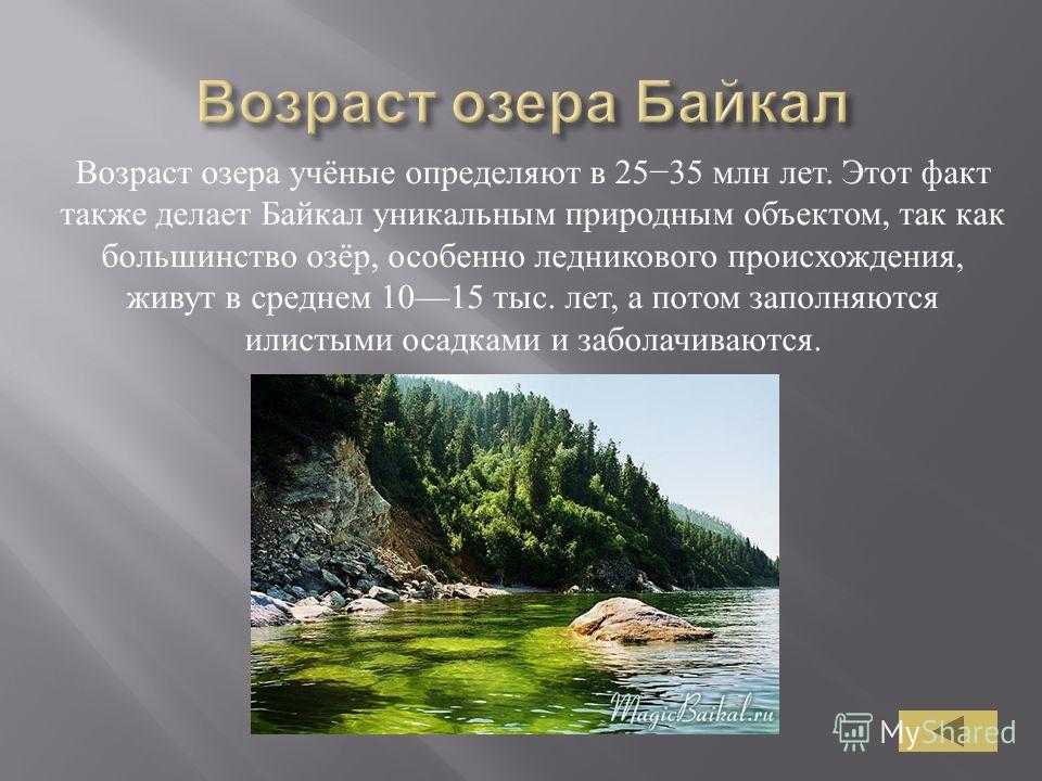 По-видимому, первая оценка ближе к истине — Байкал в самом деле очень древнее озеро. Если допустить, что возраст Байкала действительно несколько десятков миллионов лет, то это самое древнее озеро на Земле [3].