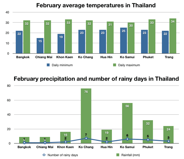 Дневные температуры воздуха нередко достигают +33 градусов. В Паттайе дожди идут немного чаще, чем в столице. Однако они имеют кратковременный характер, обычно идут во второй половине дня, а до полудня пляжи и море находятся в полном распоряжении отдыхающих.