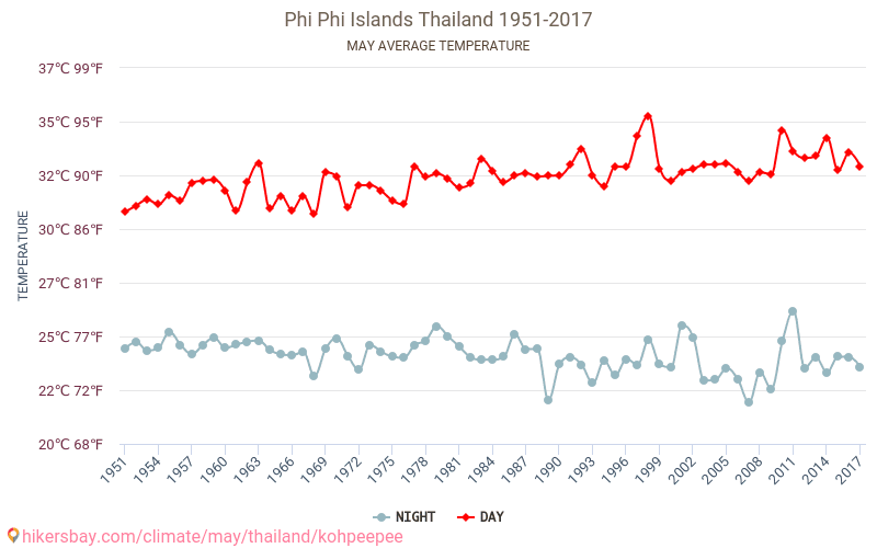 В мае Тайланд делает передышку от нескончаемого потока иностранцев. И обусловлено это в основном климатической обстановкой, которая меняется и становится малопредсказуемой. Последний месяц календарный весны, как и апрель, характеризуется максимальными температурными экстремумами. В течение дня столбик термометра неумолимо ползёт к отметке в +30°C, стабильно пересекая её к полудню.
