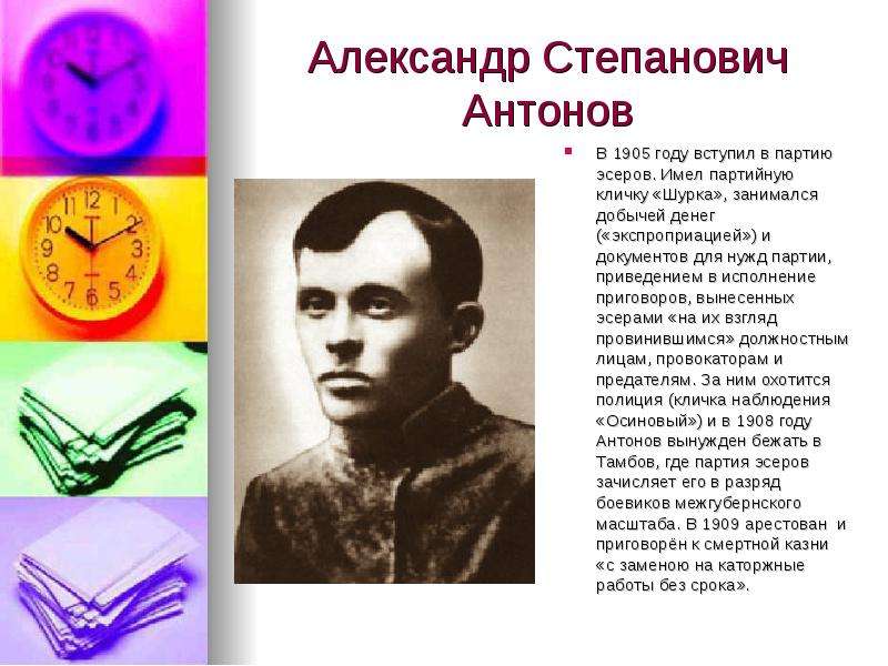 Александр Антонов (1889–1922) был эсером, которого Февральская революция спасла от длительного тюремного заключения за ограбление билетных касс на вокзалах. В 1917 году вернулся в Тамбовскую губернию и стал уездным полицейским Временного правительства. Он оставил этот пост в апреле 1918 года и ушел в подполье, организовав вооруженный партизанский отряд для сопротивления новому коммунистическому правительству.