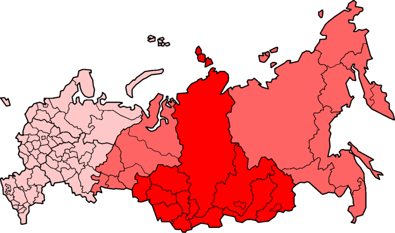 СИБИРЬ, ВКЛЮЧАЯ Дальний Восток России, покрывает 4,9 миллиона квадратных миль (12,8 миллиона квадратных километров), что составляет три четверти территории Российской Федерации или одну треть больше, чем США, и одну четверть больше, чем КАНАДА. Сибирь простирается от УРАЛа на западе более чем на 5000 км (3 000 миль) до ТИХОГО ОКЕАНА на востоке. Граничит с КАЗАХСТАНОМ, МОНГОЛИЕЙ и КИТАЕМ. В очень маловероятном случае отделения Сибири от Российской Федерации она стала бы большим государством по своим территориальным размерам, но с малочисленным населением. Размеры Сибири невыгодны, так как климат здесь обычно очень суровый, с ярко выраженной континентальностью. Северо-восточная часть показывает самые низкие температуры в Северном полушарии с — 90 градусов по Фаренгейту (-68 градусов по Цельсию) в Оймяконе и Верхоянске в Якутии. Летом температура может достигать 90 градусов F (32 градуса C).