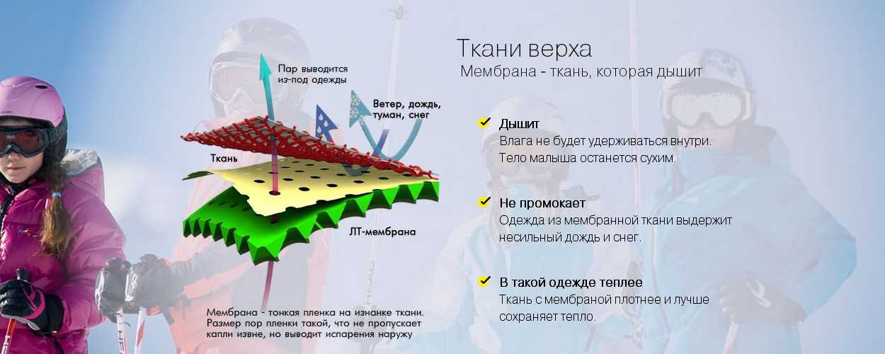 Мембрана не выполняет утепляющие функции. Она сберегает от дождя, ветра, снега, обеспечивает «дыхание» телу, способствует обеспечению тепловых комфортных ощущений.